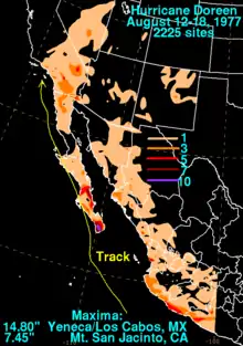 Hurricane Doreen dropped heavy rainfall along the western portions of Mexico and the Southwestern Region of the United States. In Mexico, Doreen produced heaviest precipitation along the Baja California peninsula, where rainfall peaked at 14.80 in (376 mm) in the Los Cabos Area. The mainland of Mexico also received heavy rainfall, especially in the Sierra Madre Oriental mountains.[2] In the city of Mexicali, the storm left more than 2,000 people homeless, many of which lived in shanty-style homes.[3]