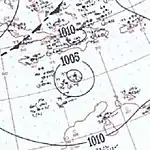 An easterly tropical wave developed into a tropical depression on August 21 in the tropical Atlantic.[4] Moving towards the west-northwest, the disturbance slowly intensified, reaching tropical storm strength at 1200 UTC on August 23 and as such was named Edith by the Weather Bureau.[7][27] Afterwards, Edith began to curve towards the northwest as it gradually intensified, attaining hurricane strength on August 26, but weakened back to a tropical storm early the next day. The storm re-intensified as it northeastward and accelerated, re-attaining hurricane status early on August 29. Edith became a Category 2 hurricane on August 30 and soon peaked with maximum sustained winds of 100 mph (160 km/h) and a minimum pressure of 967 mbar (28.6 inHg).[7] The hurricane began to gradually weaken after it passed east of the island, before becoming extratropical on August 31. The extratropical cyclone would later make a clockwise loop before dissipating completely early on September 5. Although Edith remained at sea,[7] it was suspected that the hurricane may have caused the loss of the pleasure yacht Connemara IV, after it separated from its moorings.[28]