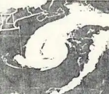 Doris made meteorological history when, on August 31, it became the first Atlantic hurricane ever to be upgraded to hurricane intensity solely on the basis of satellite pictures,[1] via the Dvorak technique.[7] The cyclone then curved northward and intensified further during the next few days, becoming a Category 2 hurricane early on September 2.[3] Based on the Dvorak technique, it is estimated that Doris peaked with maximum sustained winds of 110 mph (180 km/h) and a minimum barometric pressure of 965 mbar (28.5 inHg) shortly thereafter. By September 3, the hurricane began interacting with a non-tropical low pressure area.[7] On the following day, Doris quickly weakened to a tropical storm and transitioned into an extratropical cyclone about 830 mi (1,340 km) south-southeast of Cape Race, Newfoundland, around 06:00 UTC. The extratropical remnants weakened and then dissipated late on September 4.[3]