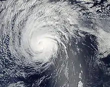 Late on August 4, the intensity of Felicia led to it taking a more northward turn in response to a mid- to upper-level trough off the coast of the Western United States.[12] Early the next morning, the storm continued to intensify and attained Category 3 status with winds of 115 mph (185 km/h).[13] Maintaining a well-defined eye, Felicia neared Category 4 status[14] and hours later, the storm attained winds of 140 mph (230 km/h) and a pressure of 937 mbar (hPa; 27.67 inHg) during the evening hours, making it the strongest Pacific storm east of the International Date Line since Hurricane Ioke in 2006[1][15] and the strongest in the eastern Pacific basin since Hurricane Daniel of 2006.[1][2] Around 5:00 pm PDT (0000 UTC August 6) Felicia reached its peak intensity with winds of 145 mph (233 km/h) and a minimum central pressure of 935 mbar (hPa; 27.61 inHg).[2][3]