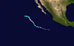 A tropical wave emerged off the western coast of Africa on June 11, remaining inconspicuous until reaching the southwestern Caribbean Sea eight days later. The system entered the eastern Pacific on June 21, where steady organization led to the formation of a tropical depression around 06:00 UTC on June 26 while located 330 mi (530 km) south-southeast of Acapulco, Mexico. Upon formation, the cyclone moved north-northwest and then west-northwest under the dictation of a subtropical ridge to its north. It intensified into Tropical Storm Calvin at 18:00 UTC on June 26, attaining a peak intensity of 50 mph (85 km/h) early the next morning in conjunction with a well-defined spiral band on radar.[16][17] Calvin then dove west-southwest and weakened as strong wind shear exposed the storm's circulation; it fell to tropical depression status at 12:00 UTC on June 28 and further degenerated to a remnant low by 06:00 UTC the next day. The low moved generally westward before dissipating well southwest of the Baja California peninsula on July 3.[16] As a tropical cyclone, Calvin caused only minor damage to roofs and highways, flooded a house, and toppled two trees.[18]