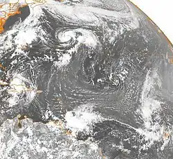 A tropical wave exited western Africa on September 1, gradually developing a concentrated area of convection. Early on September 7, satellite imagery indicated that Tropical Depression Eleven formed about 400 mi (645 km) east of the Leeward Islands. The depression intensified into Tropical Storm Gert on the following day. The newly upgraded storm passed between Dominica and Guadeloupe and continued to intensify, making landfall on southeastern Puerto Rico with winds of 60 mph (97 km/h) late on September 8. After emerging into the Atlantic, Gert weakened while passing just north of the Dominican Republic.[15] It restrengthened while turning northward near the Bahamas, becoming a hurricane on September 10. Midday on September 11, Gert peaked with winds of 105 mph (169 km/h) and a minimum pressure of 988 mbar (988 hPa; 29.2 inHg). The hurricane turned northeastward and weakened over cooler waters, passing about 100 mi (160 km) north of Bermuda on September 12 as a tropical storm. On September 14, Gert weakened further to tropical depression status, dissipating the next day.[16]