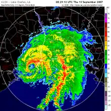 Upon becoming a tropical cyclone, the tropical depression was forecast to strengthen slowly to reach peak winds of 45 mph (72 km/h).[7] Within three hours of forming, the depression intensified into Tropical Storm Humberto.[8] A small cyclone, the storm continued to organize quickly as it turned north-northeastward, while radar imagery suggested the formation of an eye by early on September 13.[9] Based on reports from Hurricane Hunters, Humberto was upgraded to a hurricane at 0515 UTC on September 13, while located about 15 miles (24 km) off the coast of Texas.[10] The hurricane made landfall a few miles to the east of High Island at around 0700 UTC. A well-defined eye was maintained with strong convection around it, and Hurricane Hunters reported sustained winds of 85 mph (137 km/h) about two hours after landfall.[11] However, post-storm analysis later determined that the winds were a bit stronger—about 90 mph (140 km/h).[2]