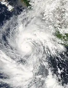 ![]() Hurricane Jimena near peak intensity south of the Baja California Peninsula, on August 31 | |