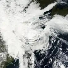 Karen quickly weakened as it moved over cooler waters,[3] and late on October 14 it degenerated back into a tropical storm as it accelerated northward.[4] Convection gradually decreased,[5] and Karen made landfall on southwestern Nova Scotia with winds of 45 mph (72 km/h) on October 15.[1] Karen retained its tropical characteristics during and after making landfall, based on a research flight out of Halifax intended to study the early stages of extratropical transition. The flight reported arced bands and a warm-core system transitioning into a more typical mid-latitude system.[6] Under the influence of a mid-latitude system, the storm turned sharply to the northeast, and after losing the remaining of its convection it became extratropical shortly after landfall. Continuing northward, the remnant low quickly weakened, and dissipated as it was absorbed by a larger extratropical storm over the Gulf of Saint Lawrence.[1]