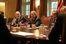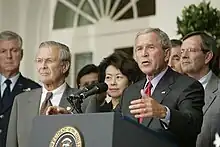 President George W. Bush declared a state of emergency in selected regions of Louisiana, Alabama, and Mississippi on August 27.[16] "On Sunday, August 28, President Bush spoke with Governor Blanco to encourage her to order a mandatory evacuation of New Orleans."[17] However, during the testimony by former Federal Emergency Management Agency (FEMA) chief Michael Brown before a U.S. House subcommittee on September 26, Representative Stephen Buyer (R-IN) inquired as to why Bush's declaration of state of emergency of August 27 had not included the coastal parishes of Orleans, Jefferson, and Plaquemines.[18] The declaration actually did not include any of Louisiana's coastal parishes, whereas the coastal counties were included in the declarations for Mississippi and Alabama.[19][20] Brown testified that this was because Louisiana Governor Blanco had not included those parishes in her initial request for aid, a decision that he found "shocking". After the hearing, Blanco released a copy of her letter, which showed she had requested assistance for "all the southeastern parishes including the City of New Orleans" as well specifically naming 14 parishes, including Jefferson, Orleans, St. Bernard, and Plaquemines.[21]