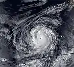 On August 30, a tropical disturbance developed south of Panama. Around 12:00 UTC on September 5, the system organized into a tropical depression as thunderstorms coalesced into loosely defined rainbands. These bands increased in intensity over subsequent hours, signaling the cyclone's intensification into Tropical Storm Kenneth by 06:00 UTC on September 6. Over the coming days, the cyclone moved on a sinussoidal-like path across the East Pacific, alternating between west and west-northwest. On September 8, Kenneth attained hurricane strength, which was followed by its development into a major hurricane on September 10, shortly after an eye first appeared on satellite. Early the following day, it became a powerful Category 4 cyclone with peak winds of 150 mph (240 km/h).[40] Kenneth displayed a small but well-defined eye embedded within a very cold central dense overcast at this time.[41] Soon, the cyclone encountered cooler waters and southwesterly wind shear on its northwest trek,[42] which caused the system to decay. Kenneth dissipated at 00:00 UTC on September 18, though its remnant circulation persisted for a few more days.[40]