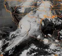 Cloud tops near the eye began to warm on the evening of September 11,[8] and despite being located over ocean temperatures of 82 °F (28 °C) ocean temperatures, which typically is favorable for strengthening, Lidia began to lose strength.[9] Because of two troughs, one over the northern Gulf of California and another over the Southwestern United States, Hurricane Lidia also began to recurve northeast on a trajectory towards mainland Mexico.[1] The hurricane had begun to weaken significantly, and 24 hours following its peak, Lidia was only a mid-level Category 2 hurricane.[10] Lidia made landfall near Culiacán in central Sinaloa at 18:00 UTC on September 13 with winds of 100 mph (160 km/h). Shortly after landfall, Hurricane Lidia began to accelerate northeastward. Lidia weakened to a depression just after crossing the U.S.-Mexico border. The depression dissipated near Austin on September 14, although the remnants of the cyclone were absorbed by a cold front.[9]