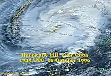 Hurricane Lili was a relatively long-lived hurricane of the 1996 Atlantic hurricane season that affected countries from Central America to the United Kingdom. Lili formed on October 14 from a tropical wave, which emerged from the coast of west Africa on October 4. After the storm formed, further strengthening of Lili was gradual, first to tropical storm status on October 16 and then to hurricane status on October 17. The next day, Lili struck Cuba and moved across the central portion of the island, the first hurricane to hit the country since Hurricane Kate in 1985. After emerging into the Atlantic Ocean, the hurricane accelerated northeastward, briefly peaking as a category 3 hurricane on the Saffir-Simpson Hurricane Scale near the Bahamas. For almost an entire week, Hurricane Lili oscillated in intensity while fluctuating several times in forward speed. About two weeks passed before Lili transitioned into an extratropical storm north of the Azores on October 27, which subsequently moved across Ireland and Great Britain.
