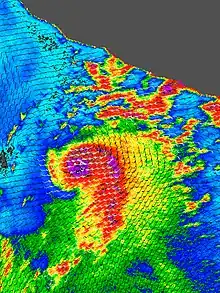 Initially, the tropical depression tracked to the northwest,[1] and was forecast to peak as a 50 mph (80 km/h) tropical storm while continuing on a northwest motion. Located within an area of weak wind shear, deep convection increased near the center, and banding features became more pronounced.[4] Anticyclonic flow aloft and a moist troposphere allowed the depression to intensity into Tropical Storm Sergio on November 14. Shortly after becoming a tropical storm, Sergio turned to the southeast, believed to be due to the flow associated with a mid- to upper-level trough to its northeast. It steadily intensified, and Sergio attained hurricane status on November 15 while located about 420 miles (680 km) southwest of Acapulco. With a small, distinct eye located in the center of the deep convection, Sergio rapidly intensified to attain peak winds of 110 mph (180 km/h) about 6 hours after becoming a hurricane.[1]