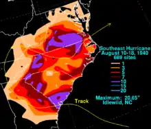 The 1940 South Carolina hurricane was a Category 2 hurricane that struck the Georgia and South Carolina coast between August 11 and 12, 1940. After forming north of the Leeward Islands, the storm moved west-northwest, moving east of the Bahamas before resuming a west-northwest track towards the Southeastern United States. Hurricane warnings were in effect for the United States coastline near and north of where the center made landfall. A 13-foot storm tide was measured along the South Carolina coast, while over 15 inches (380 mm) of rain fell across northern North Carolina. Significant flooding and landslides struck Georgia, North Carolina, Tennessee, and Virginia during the system's slow trek as a weakening tropical storm, and then as an extratropical cyclone, through the Southeast. The landslides which struck North Carolina were considered a once in a century event. Damages relating to the storm totaled $13 million (1940 USD) and 50 people perished.