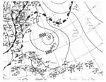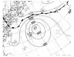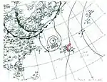 A tropical wave ascended to tropical storm status by 06:00 UTC on September 28 while located about 230 mi (370 km) south of Bermuda.[7] It moved northwest and then west-northwest, steadily organizing to attain peak winds of 65 mph (100 km/h) early on September 30. The storm then moved ashore the central coast of Maryland and was last distinguishable near Williamsport, Pennsylvania, around 00:00 UTC on October 2.[8] Considerable damage to crops, and lesser damage to structures, was inflicted throughout the Norfolk and Cape Charles, Virginia, areas, with damage estimated at $20,000.[10] Rainfall was generally light, peaking at 4.6 in (117 mm) in Diamond Springs,[9] but did result in some street flooding. A small ship and several small boats were sunk. Atlantic City, New Jersey, reported a maximum gust of 70 mph (113 km/h), and only slightly weaker gusts were recorded throughout Virginia. One death was reported.[10]