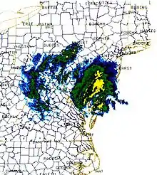 Since 1950, 143 known hurricanes, tropical storms and tropical depressions have affected the U.S. state of Maryland. Many of these storms also affect the country's capital, Washington, D.C., since the city is located on territory ceded by Maryland. Hurricanes are the most intense classification of these storms, while tropical storms and tropical depressions are generally weaker. The Delmarva Peninsula is often affected by cyclones that brush the East Coast.[1] Central and Western Maryland, as well as Washington, D.C., commonly receive rainfall from the remnants of storms that make landfall elsewhere and track northward.[2] On rare occasions, the area experiences the effects of Pacific storms; one such example of this is Hurricane Tico, which made landfall on Mexico and moved inland.