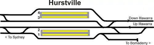 The Illawara Local pair of tracks end at Hurstville, with the up track continuing a little further to the King Georges Rd underpass. Both tracks merge onto the Illawara mainline. There are also three sidings branching off the Up Illawara Local, which are now unused with some track lifted.[3][4]