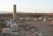 A synagogue, one of the largest in the Galilee (25 x 14 meters), was built at the end of the 3rd century or the beginning of the 4th century. The building featured two rows of columns. An Aramaic inscription in the floor mosaic reads: "Remembered well... bar Tanhum, who made this pavement of mosaic and roof. May he be blessed. Amen. Selah." A second inscription reads, "Yo'ezer the hazan and Simeon his brother made this gate of the Lord of Heaven."[3]