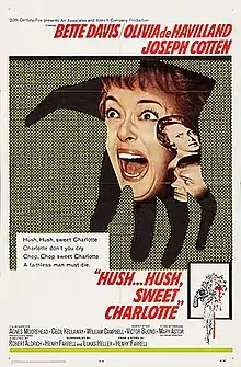 Hush...Hush, Sweet Charlotte is a 1964 American psychological thriller film directed and produced by Robert Aldrich, and starring Bette Davis, Olivia de Havilland, Joseph Cotten, Agnes Moorehead and Mary Astor in her final film role. It follows a middle-aged Southern woman, suspected in the unsolved murder of her lover from decades before, who is plagued by bizarre occurrences after summoning her cousin to help challenge the local government's impending demolition of her home. The screenplay was adapted by Henry Farrell and Lukas Heller, from Farrell's unpublished short story "What Ever Happened to Cousin Charlotte?"