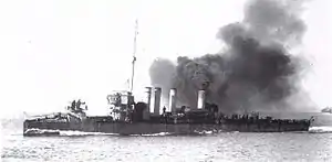 The ships were powered by two four-cylinder triple expansion steam engines, fed by four Yarrow boilers, rated at 6,000 ihp (4,500 kW), driving two shafts. This gave a speed of 28 knots (52 km/h; 32 mph). Four funnels were fitted.[4][5] One innovation compared with the Ikazuchis was that the uptake to the forward funnel was trunked rearward, allowing the funnel to be moved aft, in turn making room for the ship's bridge to be situated well aft of the turtleback forecastle. This made the bridge much drier in high seas.[2]