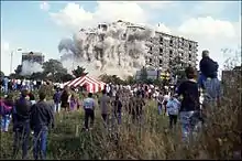 On Sunday 12 September 1993, Glasgow City Council invited local people and the media to witness the 'blowdown' of the blocks at noon. The public viewing area was placed too close to the building and debris hit the crowd, killing 61-year-old Helen Tinney who lived locally and injuring four others. Miles Glendinning and Stephen Muthesius's book Tower Block published the following year expressed the hope that it might also have "dealt a fatal blow to that most conspicuous ritual of Anti-Modernism–the demolition of tower blocks as public theatre".[13] The inquiry into the accident revealed that the demolition contractor had used twice the amount of explosive necessary to fell the structures – no explosive demolition of a tower block was carried out in Glasgow for another 9 years, partly as a consequence.
