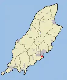 The camp consisted of 39 houses around Hutchinson Square close to Broadway in Douglas on the Isle of Man. Because of the large number of people interned in the relatively small number of houses, internees were required to share beds.[1] One of these houses, Arrandale, came to be used as the camp's sick bay.[2] Major H. O. Daniel[3] was in command of the camp until he was promoted elsewhere. He was a popular leader and was responsible for enabling much of the creative activities of the camp.