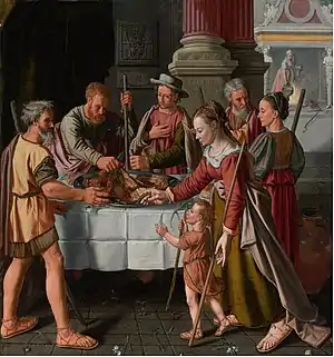 The first Passover feast (Sotheby's New York sale, 26 January 2012, lot 105) illustrates Huybrecht's technique. In this work he employed a formula already used by Aertsen in the early 1550s. It is characterised by the high viewpoint, which allows every aspect of the scene, in this case, the Passover Feast, to be explained in detail. The scale of the composition is relatively large and the figures are almost lifelike positioned in the immediate foreground. These traits clearly show his indebtedness to the colorful naturalism of Aertsen's later works of this type. The scene is dominated by the large figures who are distributed on all levels of the pictorial space and connected by eye contact and individual gestures. Huybrechts demonstrates in this picture that he could give a more elegant and idealized treatment of figures than Aertsen's or his brother Joachim.[7]