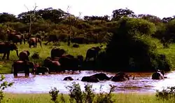 ![]() African bush elephants in a waterhole of the park | |