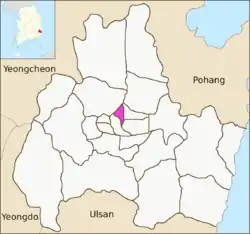 Hwangseong-dong is both an administrative and legal dong or a neighbourhood in the administrative subdivisions of the Gyeongju City, North Gyeongsang province, South Korea. It is bordered by Yonggang-dong on the east, Hyeongok-myeon on the west and north and Seongnae-dong on the south. Its 3.84 square kilometers are home to about 29,140 people.[2] It has two elementary schools, three middle schools and one high school[3]