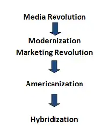 To explain the global diffusion of American campaign and marketing techniques there have been two models, the Shopping and Adoption Model.[10] Both models take into respect that American aspects, practices and strategies of campaigning find resemblance in other country's campaigning. Both use different perspectives to find the causal factors and future developments. The Adoption Model detects a standardization which will lead to a “gradual phase-out of country-specific traditional campaign styles and their substitution by capital-intensive, media- and consultant-driven campaign practices”.[11] Today the Shopping Model is preferred because it focuses on the process of hybridization and proclaims a “country-specific supplementation of traditional campaign practices with select features of the American style of campaigning”.[11] To summarize, the hybridization approach is the evolutionary explanation approach which arose from different earlier ones to explain changes in election campaigning.