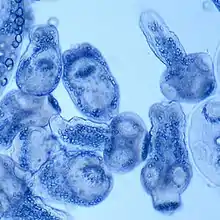 From the embryo released from an egg develops a hydatid cyst, which grows to about 5–10 cm within the first year and is able to survive within organs for years.[25] Cysts sometimes grow to be so large that by the end of several years or even decades, they can contain several liters of fluid. Once a cyst has reached a diameter of 1 cm, its wall differentiates into a thick outer, non-cellular membrane, which covers the thin germinal epithelium. From this epithelium, cells begin to grow within the cyst. These cells then become vacuolated, and are known as brood capsules, which are the parts of the parasite from which protoscolices bud. Often, daughter cysts also form within cysts.[24]