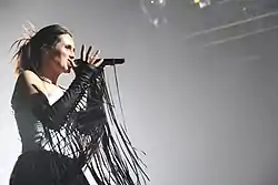 On July 12, the first material came to the public eye, with the band revealing a teaser trailer, with no title or song titles revealed.[30][31][32] In the next month, the band announced the title of the lead single, "Paradise (What About Us?)", also uploading a teaser trailer revealing some lyrics and a guitar solo in anticipation for the release. The music video and EP were released on September 27. On October 25 and 26, den Adel and Westerholt presented an unknown number of songs to the press.[33][34] The official teaser trailer came out on November 8, along with the official announcement of the album name and release dates.[35] On November 21, the band revealed that it was working again with director Patric Ullaeus, who made the video of "Mother Earth", on two new music videos to promote the album, being them "Dangerous" featuring Howard Jones, which was released on December 20,[4] and "Whole World is Watching" featuring Dave Pirner.[36] At the end of November, Sharon traveled to Finland to start promoting the album on a radio station[37] and present it to the press in France, Germany[38] and the United Kingdom.[39] On December 4, the first show of the upcoming promotional tour to have the tickets to be sold out was the one at the Heineken Music Hall, Amsterdam.[40] During the promotional travelings, den Adel gave critics and radio stations access to the recording, and the first public impression from the album came through German radio station Rock Antenne, which classified the album as "fast" and "heavy" and gave it a score of 5/5.[41] The third single, "Whole World Is Watching", was the chosen song for the album promotion in Poland, debuting on the Polish national radio station Polskie Radio Program III on January 10, 2014, in a special version featuring Polish singer Piotr Rogucki.[42][43][44] The band then went on a special trip to the United States to promote a listening party in Los Angeles on January 24, with the presence of den Adel, Westerholt and Jolie,[45] a signing session in New Jersey[46] and to promote the album on radio stations.[47] In the meantime, the band appeared for the first time on the cover of an American magazine.[24] A few days later, on January 15, 2014, the main version of the song, featuring Pirner, was released as a promotional song on Dutch/Belgian radio station Q-music.[48] As heading back to Europe, the band went on to visit popular Dutch radio stations such as 538 and 3FM and television programs[49] for interviews and acoustic performances.[50][51] On January 20, the band announced a try-out show for the upcoming tour at the Effenaar, in Eindhoven (NL), to be held on February 20, having the tickets sold out on the same day.[52] The tour was originally planned to start in January 2014, but it was postponed to a month later, so the band could polish more the songs before releasing the album and also have more time to rehearsals for the following tour.[53] After this period of radio and television appearances for acoustic performances and interviews, the band is embarked on the Hydra World Tour, engaging on a try-out show on February 20 at the Effenaar, Eindhoven. Tickest for the show were completely sold out at the same day it was put on sale.[54] The first official show occurred on February 26, in Helsinki, Finland, and the arena tour was scheduled to pass primarily in Europe before the summer festivals season. Due to great demand, additional shows were announced and several venues were changed to larger ones with the intention to accommodate more people.[55][56] At the end of the European leg, the tour had an attendance of over 120.000 people.[57]