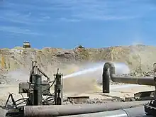 Hydraulic mining is a form of mining that uses high-pressure jets of water to dislodge rock material or move sediment.[1] In the placer mining of gold or tin, the resulting water-sediment slurry is directed through sluice boxes to remove the gold. It is also used in mining kaolin and coal.