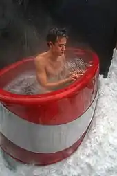 Hydraulophones may be built into hot tubs for use in cold weather. This solves the problem of keeping the hydraulist warm, as well as keeping the hydraulic fluid (e.g. water) heated by way of standard pumping and heating equipment. In this kind of hydraulophone (e.g. balnaphone, from the Greek "balnea" meaning "bath") the hydraulist is immersed in the hydraulic fluid used by the instrument.