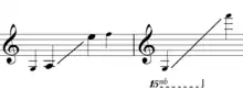 The standard A to E range, in which it is possible to play with polyphonic embouchure on any or all diatonic notes at the same time, is shown on the left side of the diagram. When playing only monophonically, some additional range is possible on certain hydraulophones, indicated here by small cue notes at the end-points.