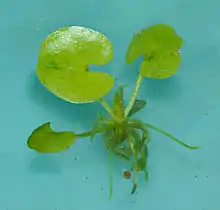 Hydrocharis morsus-ranae, frogbit, is a flowering plant belonging to the genus Hydrocharis in the family Hydrocharitaceae. In North America, it is referred to as common frogbit or European frog's-bit[1] to distinguish it from the related American frogbit (Limnobium spongia).