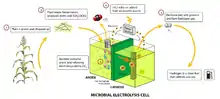 Besides dark fermentation, electrohydrogenesis (electrolysis using microbes) is another possibility. Using microbial fuel cells, wastewater or plants can be used to generate power. Biocatalysed electrolysis should not be confused with biological hydrogen production, as the latter only uses algae and with the latter, the algae itself generates the hydrogen instantly, where with biocatalysed electrolysis, this happens after running through the microbial fuel cell and a variety of aquatic plants[85] can be used. These include reed sweetgrass, cordgrass, rice, tomatoes, lupines and algae.[86]