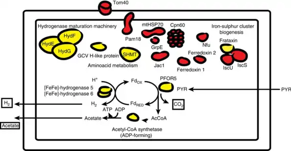 - Schneider RE, Brown MT, Shiflett AM, Dyall SD, Hayes RD, Xie Y, et al. (November 2011). "The Trichomonas vaginalis hydrogenosome proteome is highly reduced relative to mitochondria, yet complex compared with mitosomes". International Journal for Parasitology. 41 (13–14): 1421–34. doi:10.1016/j.ijpara.2011.10.001. PMC 4437511. PMID 22079833.