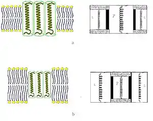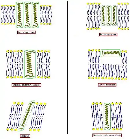 - When the hydrophobic part of a transmembrane protein is too thin to match the hydrophobic bilayer thickness (right part of Figure), again this might result in protein aggregation, or changes in backbone conformation and/or side chain orientation. Too short peptides may adopt a surface localization. Lipids could decrease the local bilayer thickness by disordering their acyl chains.