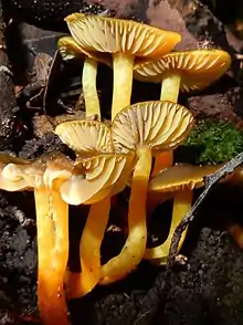 Hygrocybe aurantipes is a gilled fungus of the waxcap family found in a few scattered locations in wet forests in eastern Australia. It is a distinctive small mushroom with a 2–4 cm diameter olive-brown cap and golden-yellow stipe and gills, not easily confused with any other species. Known only from Lane Cove Bushland Park in Sydney's suburban Lower North Shore, Hazelbrook and Mount Wilson in the Blue Mountains, it has been designated as vulnerable as defined by the NSW Biodiversity Conservation Act 2016, by the New South Wales Government.