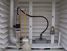 An optical hygrometer measures the absorption of light by water in the air.[10] A light emitter and a light detector are arranged with a volume of air between them. The attenuation of the light, as seen by the detector, indicates the humidity, according to the Beer–Lambert law. Types include the Lyman-alpha hygrometer (using Lyman-alpha light emitted by hydrogen), the krypton hygrometer (using 123.58 nm light emitted by krypton), and the differential absorption hygrometer (using light emitted by two lasers operating at different wavelengths, one absorbed by humidity and the other not).