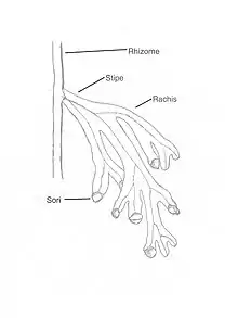 The stipes are winged almost to the base, often crinkled and emanate at intervals along the rhizome.[1][2][9] The fronds are dark green, dull and membranous, ranging in size from 38–210 mm long;[2] they are triangular to ovate in shape and pinnate to tripinnate.[1] The rachises are winged, glabrous, dark brown proximally and pale brown distally.[3] The ultimate lamina segments are narrowly oblong and have a spreading finger-like appearance; the margins are entire, with each ultimate segment containing a single conspicuous vein.[9][3]