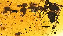 Burmese amber is fossil resin dating to the early Late Cretaceous Cenomanian age recovered from deposits in the Hukawng Valley of northern Myanmar. It is known for being one of the most diverse Cretaceous age amber paleobiotas, containing rich arthropod fossils, along with uncommon vertebrate fossils and even rare marine inclusions. A mostly complete list of all taxa described up until 2018 can be found in Ross 2018;[1] its supplement Ross 2019b covers most of 2019.[2]