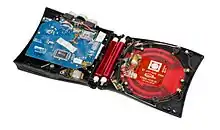 The HyperScan is a home video game console from the toy company Mattel. It is unique in that it includes a 13.56 MHz radio-frequency identification (RFID) scanner that reads and writes to the "cards" which, in turn, activate features in and save data from the game. Players are able to enhance the abilities of their characters by scanning cards.[1]