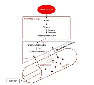 The total average daily production of bilirubin in humans is 4 mg/kg. 80% of which is derived from haemoglobin (Hb) produced by erythrocyte breakdown, with the remaining from heme proteins, like myoglobin and cytochrome, turnover.[5] Hb is broken down into globin and haem, which then undergoes a multi-step enzymatic degradation process.[4] After two reactions converting Hb into bilirubin IX-alpha, this unconjugated bilirubin is released into the bloodstream, where it binds reversibly with plasma protein albumin and dissociates to be taken up by liver cells through organic anion transport proteins (OATPs) on cell membranes.[1] Inside hepatocytes, bilirubin is conjugated through uridine diphosphate-glucuronosyl-transferase (UGT) to form bilirubin diglucuronide, otherwise termed conjugated bilirubin, which is transported across the plasma membrane by multidrug resistant-associated protein 2 (MRP2) to finally enter bile capillaries.[4] From there, conjugated bilirubin is secreted into the small intestine with bile where a portion is reabsorbed and cycled back to the liver. Unabsorbed bilirubin reaches the colon to be hydrolysed and reduced into urobilinogen that is excreted in faeces.[4]