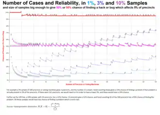 Election audits typically test a sample of machine-counted precincts to see if recounts by hand or machine match the original counts. Mismatches result in either a report or a larger recount. The sampling rates are usually defined by law, not statistical design, so for a legally defined sample size n, what is the probability of missing a problem which is present in K precincts, such as a hack or bug? This is the probability that k = 0. Bugs are often obscure, and a hacker can minimize detection by affecting only a few precincts, which will still affect close elections, so a plausible scenario is for K to be on the order of 5% of N. Audits typically cover 1% to 10% of precincts (often 3%),[9][10][11] so they have a high chance of missing a problem. For example, if a problem is present in 5 of 100 precincts, a 3% sample has 86% probability that k = 0 so the problem would not be noticed, and only 14% probability of the problem appearing in the sample (positive k):