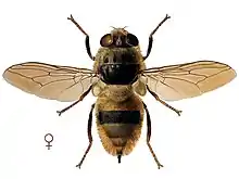 Warble fly is a name given to the genus Hypoderma: large flies which are parasitic on cattle and deer. Other names include "heel flies", "bomb flies" and "gadflies", while their larvae are often called "cattle grubs" or "wolves." Common species of warble fly include Hypoderma bovis (the ox warble fly) and Hypoderma lineatum (the cattle warble fly) and Hypoderma tarandi (the reindeer warble fly). Larvae of Hypoderma species also have been reported in horses, sheep, goats and humans.[1] They have also been found on smaller mammals such as dogs, cats, squirrels, voles and rabbits.