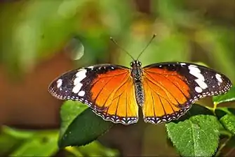 The females H. misippus mimic (in appearance) the similar-sized Plain Tiger, a toxic butterfly with the toxic Milkweed as its host plant. The vibrant colours of the Plain Tiger advertise its unpalatable nature to predators around, so the Danaid female sends out the same signal, regardless of it not being toxic