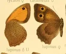 Hyponephele lupina, the Oriental meadow brown or branded meadowbrown, is a butterfly of the family Nymphalidae. It is found in North Africa, south western Europe, southern Russia, Asia Minor, southern Siberia, Middle Asia, Iran and from Baluchistan to Nepal.Seitz describes it thus- lupinus Costa (47 e) is rather considerably larger than the forms [of Epinepele] so far named; the rusty yellow on the underside of the forewing is brighter, the underside of the hindwing strongly speckled. Southern Italy, Greece.[1]