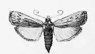 The wingspan is about 30 mm. Adults have brown forewings with a faint zigzag pattern and buff hindwings, both with dark veins.[2]
