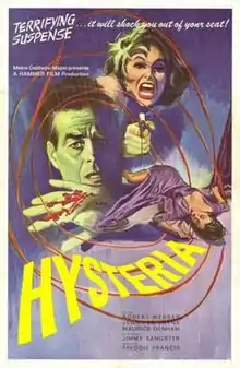 Hysteria is a 1965 British murder mystery film directed by Freddie Francis, produced by Hammer Films and released by Metro-Goldwyn-Mayer.[1] The film stars Robert Webber and Anthony Newlands.[2]