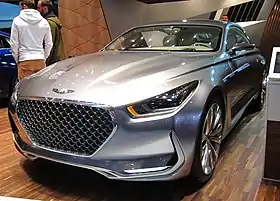 The Hyundai HCD-16 Vision G concept debuted at the Pebble Beach Concours d'Elegance in August 2015; just ahead of the official reveal, the car was unveiled at the Los Angeles County Museum of Art.[65] Although the California studio took the lead, input from Hyundai's global studios was incorporated into the final design.[65] When Hyundai launched its Genesis Motor luxury division later that year, the Vision G was rebranded as a Genesis, consistent with the vehicle's badging.[66] It is powered by a 5.0L Tau V8 engine with an output of 420 hp (310 kW) and 383 lb⋅ft (519 N⋅m).[65]