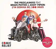 In 2007, the Proclaimers re-recorded the song with Peter Kay and Matt Lucas as their characters Brian Potter from Phoenix Nights and Andy Pipkin from Little Britain respectively. There is a slight change in the title of the song, with the parentheses placed around "(I'm Gonna Be)" rather than "(500 Miles)". The lyrics also include a change, with the words "roll 500 miles" replacing "walk 500 miles", because the characters Brian Potter and Andy Pipkin are both in wheelchairs. "(I'm Gonna Be) 500 Miles" was released as a charity single for Comic Relief immediately following its performance on the Comic Relief 2007: The Big One television show on BBC1 on 16 March 2007.[35] It reached number 3 on the official UK Singles Chart on download sales alone, and one week later reached number 1, where it remained for three weeks. It sold 126,000 copies in its first week, making it the biggest-selling number one of the year up to that point.[36] Its sales were double that of the official Comic Relief single by Girls Aloud vs. Sugababes, and their cover of Aerosmith's "Walk This Way". The song ended 2007 as the year's 8th biggest-selling single in the UK.[37] The song was popular in Ireland as well and peaked at #7 in Irish Singles Chart.